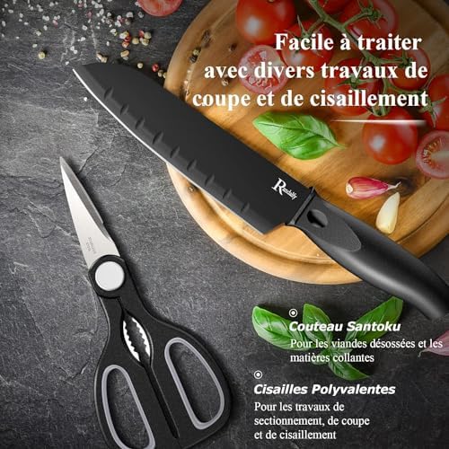 HAUTE QUALITÉ: La lame supérieure en acier inoxydable à haute teneur en carbone est appliquée avec la technologie d’oxyde noir BO, les lames de couteau avec un revêtement antiadhésif en céramique qui rend le tranchage encore plus facile et les lames restent tranchantes plus longtemps. L’ensemble de couteaux professionnels pour la cuisine est pratique, tranchant et précis pour couper les aliments.