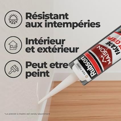 Intérieur et extérieur – Ce mastic étanche à une excellente résistance aux UV, aux intempéries, à l’humidité et au vieillissement. De plus, il peut être peint après séchage.