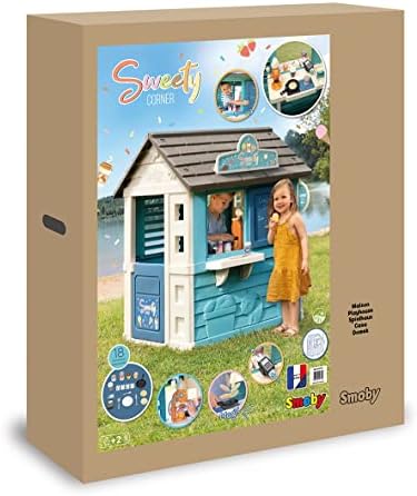 Maison sur le thème du goûter. Comptoir et espace de préparation. Machine à glaces. 18 accessoires inclus dont 2 crêpes, 2 glaces, 1 lecteur de CB, 4 tickets de caisse, 1 poêle.