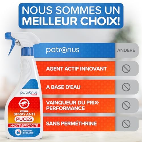 ✅ POLYVALENT : Des puces causées par un chien ou un chat ? Les puces des chiens et les puces des chats ne sont plus un problème grâce au spray anti-puces Patronus. Idéal pour la maison, pour les couchages d’animaux ou les textiles.